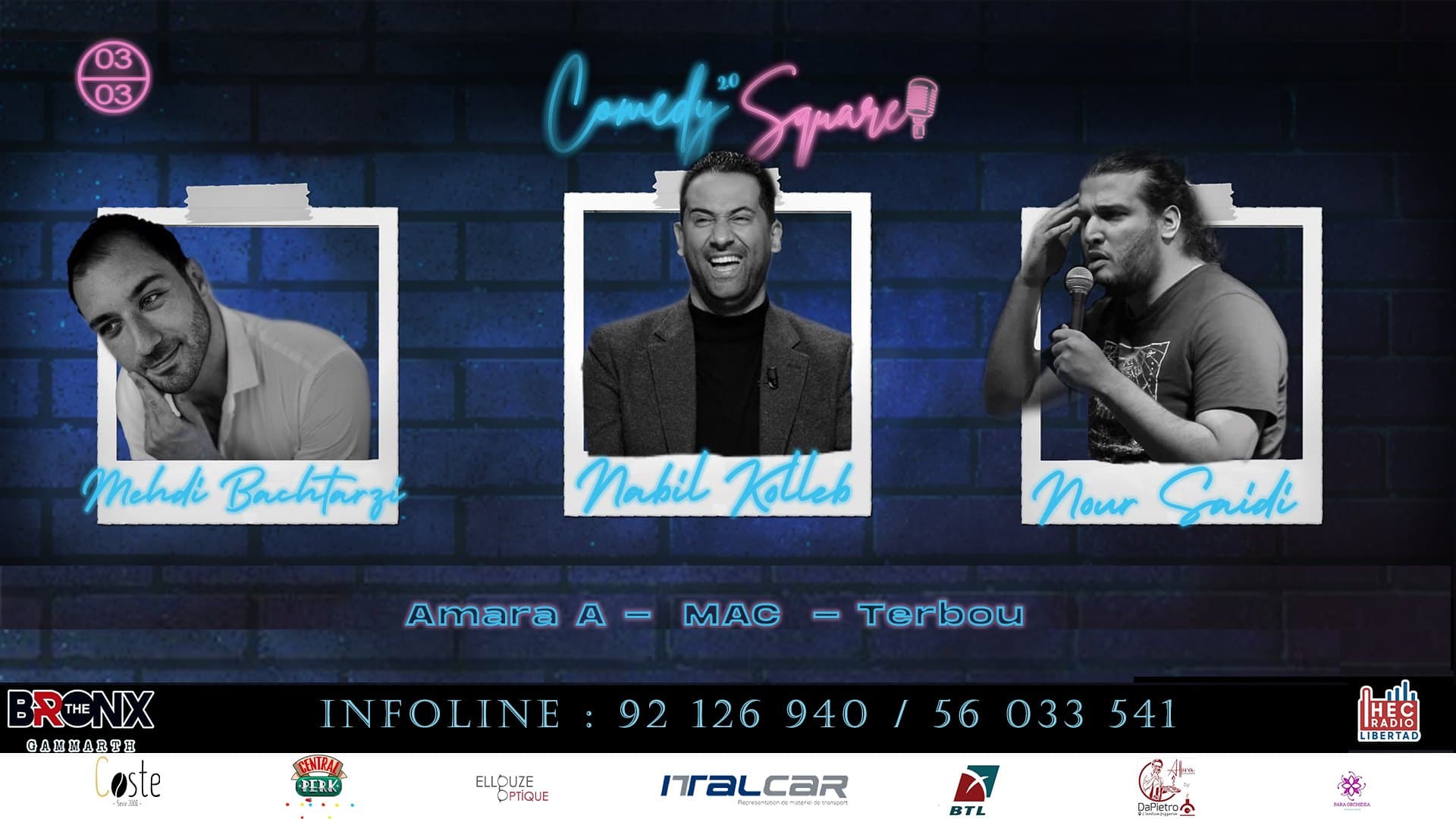 Avec Nour Saidi , Mahdi Bachterzi et Nabil Kolleb les stars de la soirée vous ne rentrerez que comblés.