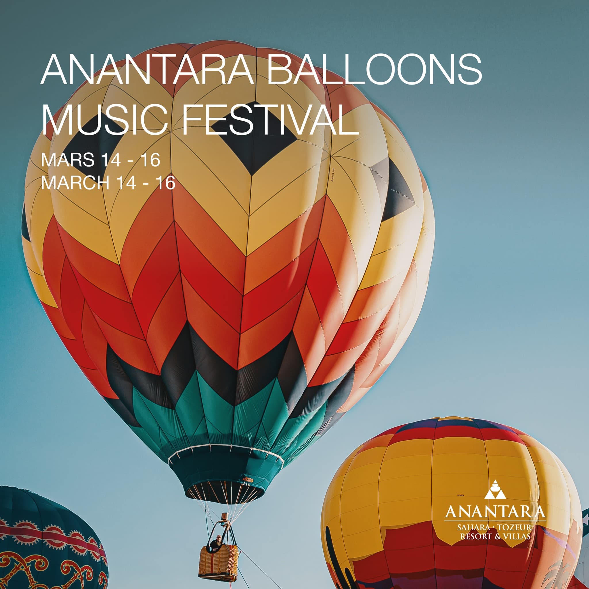 Ce lundi 14 mars 2022, en plein milieu du Sahara tunisien, Anantara Resort & Villas vous réserve 3 jours paradisiaques, lors d’un festival de musique et de vols en montgolfière ! Envie de survoler les dunes de Tozeur en admirant ses trésors ? On vous dévoile tout le programme ici.